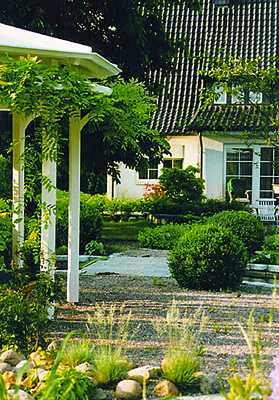 Der Pavillon ist mit Blauregen bepflanzt.Im Hintergrund an der Terrasse ist ein Blumenhartriegel erkennbar. Und dann die Buchskugeln, die in dem gesammten Garten plaziert wurden und so helfen die Bereiche nahtlos inneinander übergehen zu lassen.